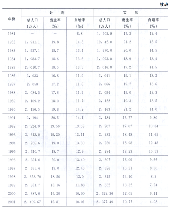 2001年,人口計劃指標(biāo)為,人口出生率16.8‰,人口自然增長率10.01‰,總?cè)丝谶_到2409.7萬人。執(zhí)行結(jié)果是,人口出生率10.7‰,人口自增率4.98‰,總?cè)丝谶_到2377.5萬人。