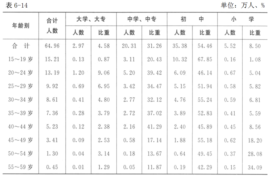 在失業(yè)人口中受過高等教育的人口占4.58%,受過中等教育的人口占31.26%,受過初中教育的人口占54.46%,受過小學教育的占8.5%。分年齡組來看,20歲~24歲中受過高等教育的失業(yè)人口比例最高為9.06%;受過中等教育的失業(yè)人口在40歲~44歲年齡組,所占比例最高達到41.29%;受過初中教育的失業(yè)人口在15歲~19歲所占比例最高達到67.85%,其次在30歲~34歲和45歲~49歲年齡組所占比例分別達到55.24%和55.18%。