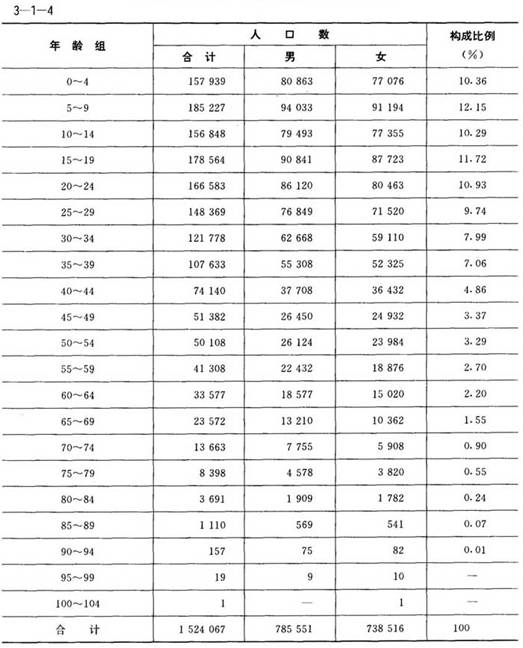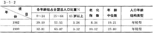1990年,15~64歲的勞動(dòng)人口系數(shù)為63.87%;0~14歲組的少兒系數(shù)為32.81%,屬成年型;老化系數(shù)為3.32%,屬年輕型;老化指數(shù)為10.12%,屬年輕型;年齡中位數(shù)為27.80歲,屬成年型。