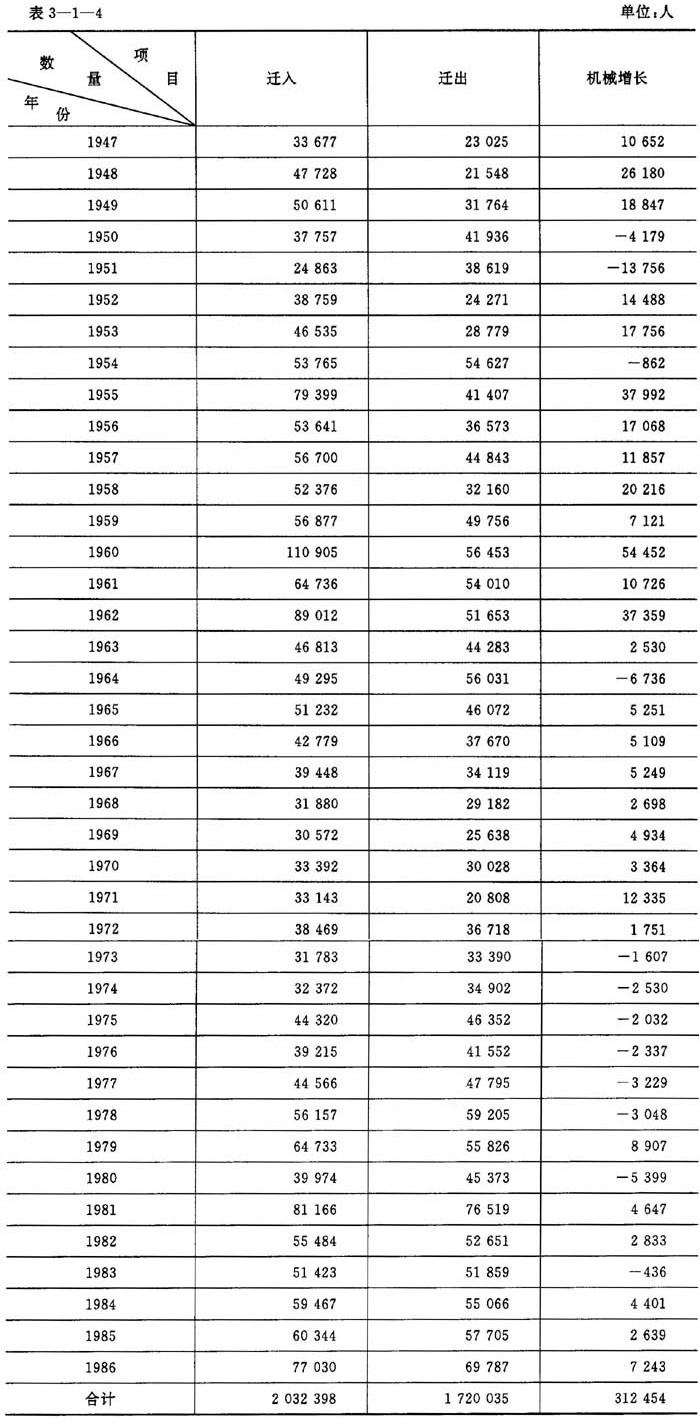 1947—1986年,遷入哲里木盟的人口達203.24萬,遷出172.0萬,機械增長31.24萬。其中1960—1962年增長幅度最大,增長10.25萬。出現負增長的年份有12個,主要集中在1973—1980年之間。