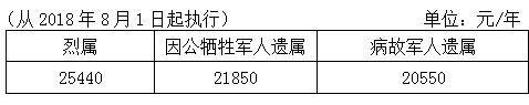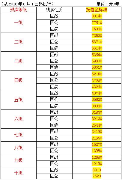 調(diào)整后,一級(jí)因戰(zhàn)、因公、因病殘疾軍人(含傷殘人民警察、傷殘國(guó)家機(jī)關(guān)工作人員、傷殘民兵民工)的殘疾撫恤金標(biāo)準(zhǔn)每人每年分別為80140元、77610元、75060元;十級(jí)因戰(zhàn)、因公殘疾軍人(含傷殘人民警察、傷殘國(guó)家機(jī)關(guān)工作人員、傷殘民兵民工)的殘疾撫恤金標(biāo)準(zhǔn)每人每年分別為8910元、7620元。烈屬(含因公犧牲軍人遺屬、病故軍人遺屬)的定期撫恤金其中烈屬每人每年25 440元,因公犧牲軍人遺屬每人每年21 850元,病故軍人遺屬每人每年20 550元。在鄉(xiāng)退伍紅軍老戰(zhàn)士的生活補(bǔ)助標(biāo)準(zhǔn)其中在鄉(xiāng)退伍紅軍老戰(zhàn)士每人每年55 570元,在鄉(xiāng)西路軍紅軍老戰(zhàn)士每人每年55 570元,紅軍失散人員每人每年25 070元。