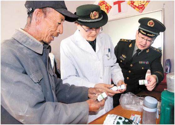 武警內(nèi)蒙古總隊醫(yī)院的工作人員為呼和浩特市清水河縣韭菜莊鄉(xiāng)的貧困村民入戶發(fā)放藥品