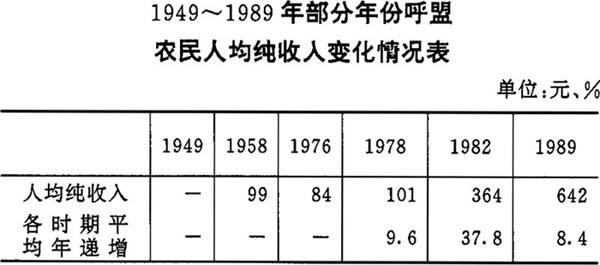 1949—1989年部分年份呼盟農(nóng)民人均純收入變化情況表