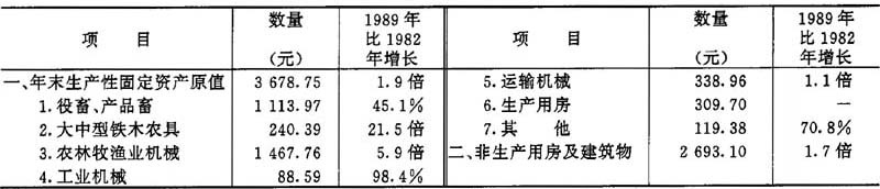 據(jù)抽樣調(diào)查,1989年,平均每戶農(nóng)民擁有生產(chǎn)性固定資產(chǎn)總額3678.75元,比1982年增長1.9倍。平均每百戶擁有大中型拖拉機(jī)4臺、小型拖拉機(jī)和手扶拖拉機(jī)31臺、膠輪大車28輛,役畜、產(chǎn)品畜253頭,機(jī)動(dòng)脫粒機(jī)4臺、膠輪手推車63輛、抽水機(jī)3臺、水泵4臺,同過去相比均有較大幅度增加。另據(jù)調(diào)查,農(nóng)民家庭耐用物品、生活用房擁有量增加,檔次提高。