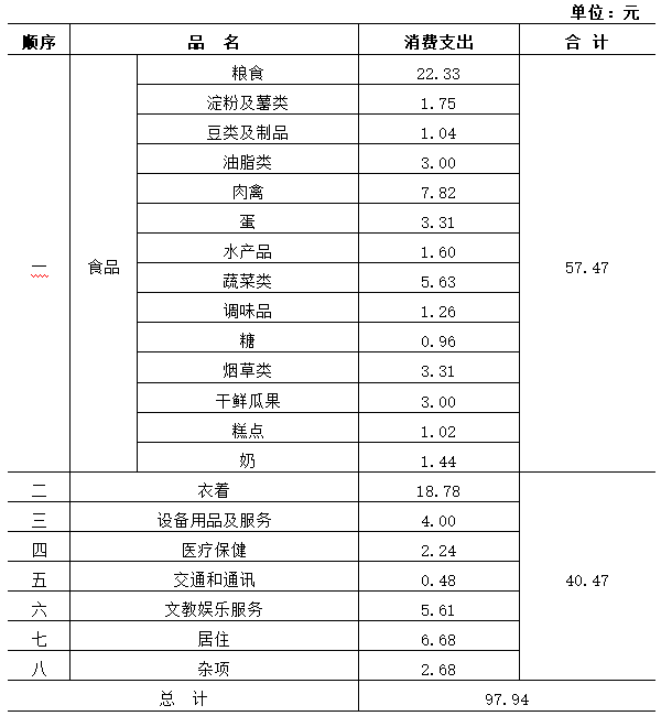 為確定最低生活保障線的標準,呼和浩特市社會經(jīng)濟調(diào)查隊采用國際上的“市場萊藍式標準”根據(jù)居民居住的地理位置,用隨機等距抽樣的辦法,抽取200戶居民為樣本,并對200戶按每戶人均月收入由低到高進行排隊。然后分成低收入戶、中等偏下收入戶、中等收入戶、中等偏上收入戶、高收入戶五個收入段。結(jié)果低收入20戶,占樣本戶的10%。對這些低收入戶的日常生活開支情況進行發(fā)卡登記,詳細記錄其糧食、燃料、副食、房租、水電、洗理、衣著、文教、醫(yī)療、衛(wèi)生等生活必需項目。按1994年市場價格測算,得出每人每月最低生活標準為97.44元。(見下表)