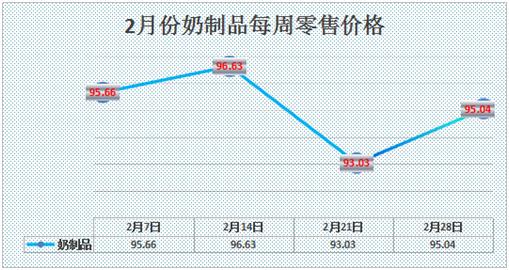 由于1月奶制品價格由93.67元上漲至95.88元,本月恢復(fù)為93.96元,環(huán)比下降2%,與2019年同期相比,除常溫奶同比下降1.69%外,其余監(jiān)測樣本全部上漲。
