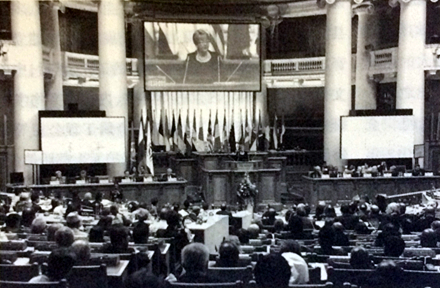 這時,中國代表團全體成員起立向大會主席以及各國代表致謝。出席大會的蒙古、阿爾及利亞等20多個國家的代表,以及國際組織負責人紛紛走到中國—CHINA 席位前,與中國代表團成員擁抱握手表示熱烈祝賀。