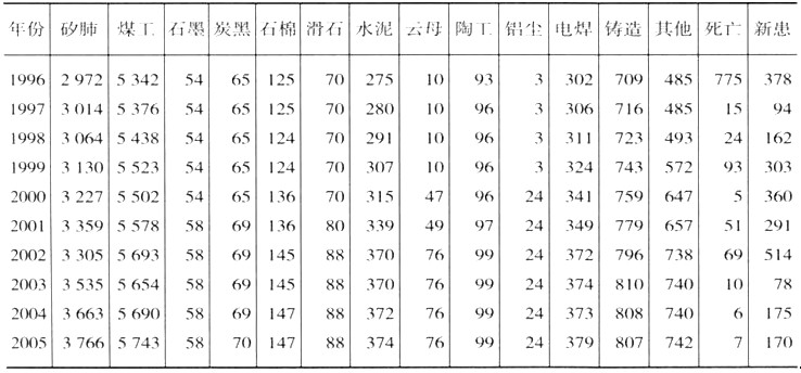 至2005年底,已對(duì)全區(qū)存在職業(yè)病危害因素的2 833個(gè)職業(yè)建立了衛(wèi)生檔案,對(duì)接觸職業(yè)病危害因素的289 997名勞動(dòng)者建立了職業(yè)健康監(jiān)護(hù)卡。全區(qū)共診斷塵肺17 149例,其中現(xiàn)患病例12 401例,死亡4 748例;共診斷急慢性中毒1 308例,其他職業(yè)病1 008例。