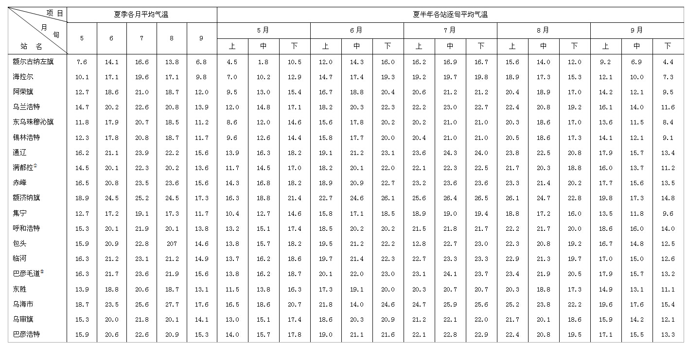 表1-2-1內(nèi)蒙古自治區(qū)氣溫年變化表(夏季)