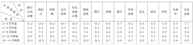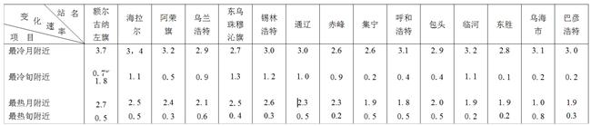 表1-2-3內(nèi)蒙古自治區(qū)最冷(熱)期附近氣溫變化速率(℃/月或旬)表