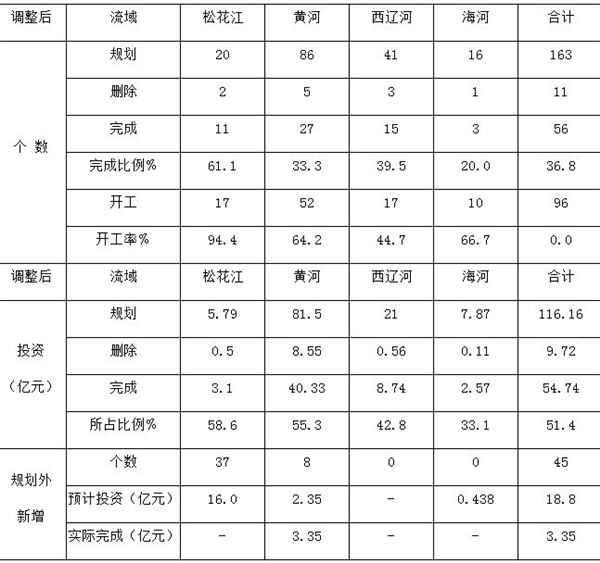注:“刪除”指規(guī)劃中項目因無法實施而從規(guī)劃中去除;“完成”指規(guī)劃中項目完成情況;“完成比例”和“開工率”均為去除刪除項目后的比例;松花江流域未統(tǒng)計新增項目實際完成投資,故新增項目實際投資并不完全。