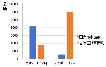 2020年,全區(qū)組織完成用地預(yù)(初)審共計(jì)62項(xiàng),預(yù)審總規(guī)模13162.24公頃,同比增長9.72%,其中:報(bào)自然資源部預(yù)審6項(xiàng),預(yù)審總規(guī)模1117.47公頃,同比下降86.62%;自治區(qū)預(yù)審56項(xiàng),預(yù)審總規(guī)模為12044.77公頃,同比增長2.31倍(圖1)。