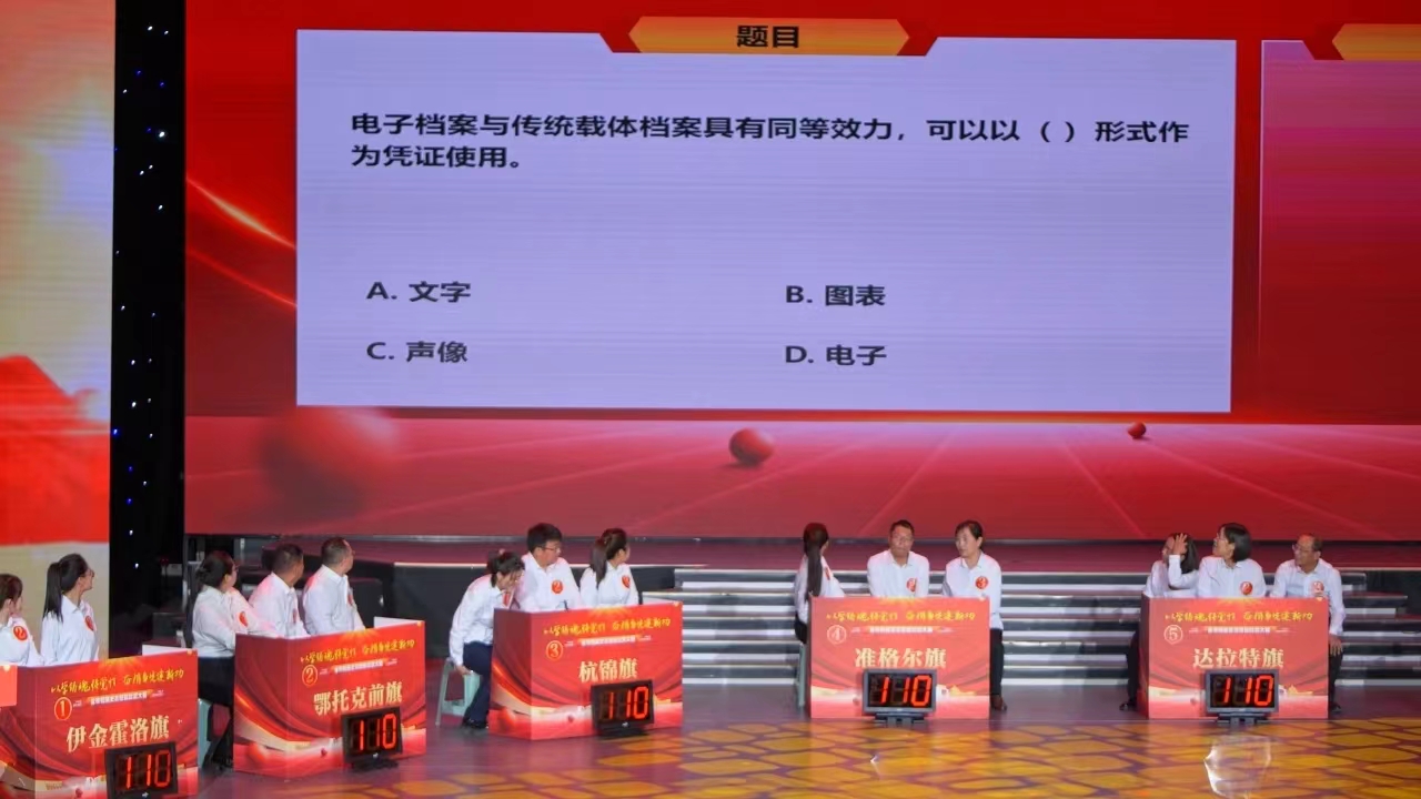 為推進第二批主題教育,激勵干部職工“以學鑄魂強黨性 奮楫爭先建新功”,10月27日,鄂爾多斯市檔案局、鄂爾多斯市檔案史志館共同舉辦的檔案史志技能比武大賽,在鄂爾多斯市融媒體中心一號演播廳開展。自治區(qū)檔案館綜合業(yè)務指導處處長李秀萍、自治區(qū)黨委黨史和地方志研究室研究一處副處長李瀟楓、盟市志業(yè)務處副處長齊迎春到場指導,鄂爾多斯市檔案史志館館長王冠中致開幕辭。