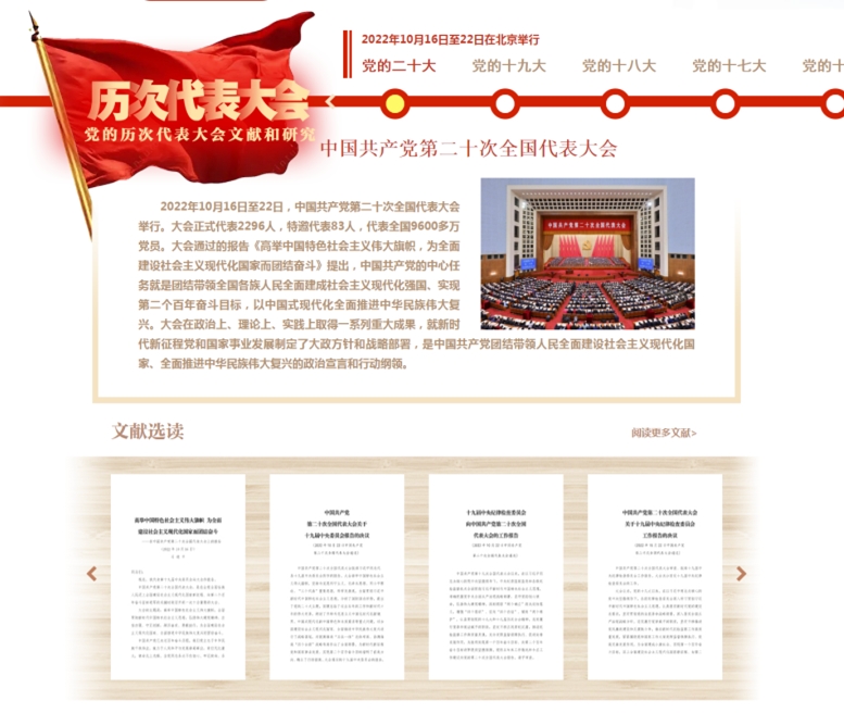 “黨的歷次代表大會文獻(xiàn)和研究”欄目系統(tǒng)匯集自黨的一大至黨的二十大歷次黨的全國代表大會和中央全會等重要文獻(xiàn)以及相關(guān)研究成果。