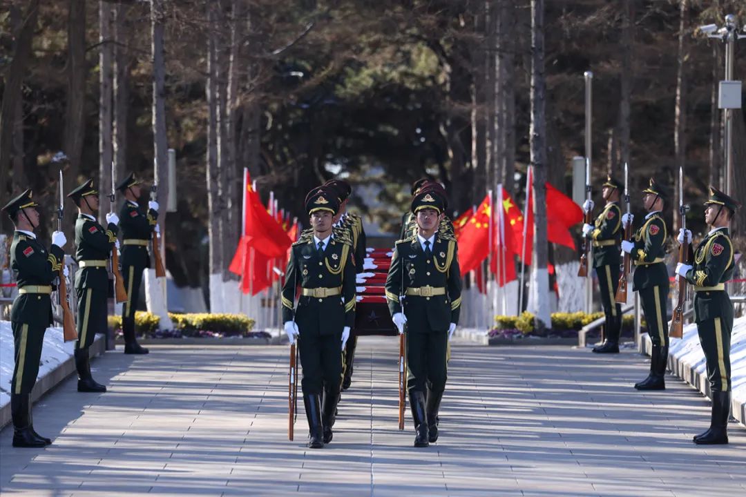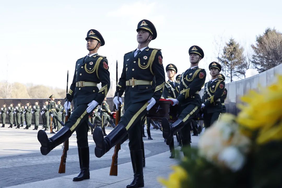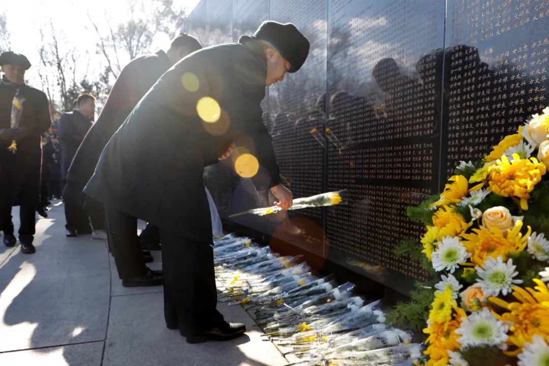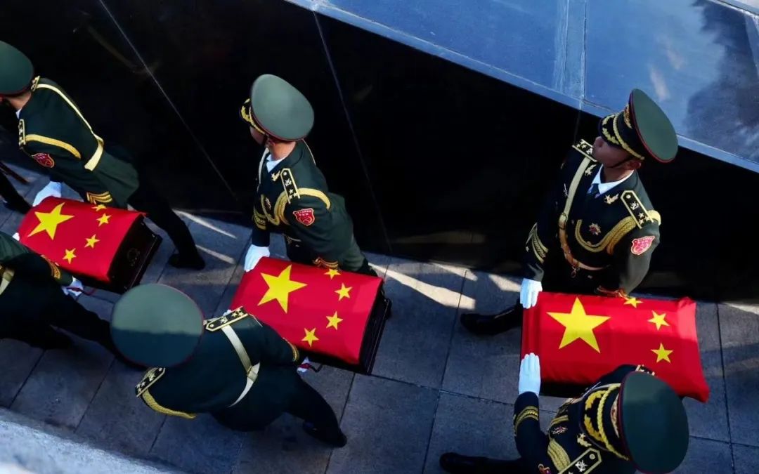 隨著《思念曲》再次低回奏響,禮兵們抬起志愿軍烈士棺槨繞廣場半周,緩緩走向安葬地宮。全場人員凝視烈士棺槨,向烈士獻花致敬,并瞻仰烈士英名墻。據(jù)了解,2014年至今,累計共有938位在韓志愿軍烈士遺骸在這里安息。