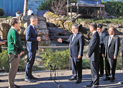 在動(dòng)物園熊貓館,李強(qiáng)聽取中澳專家對(duì)兩國(guó)大熊貓保護(hù)合作研究和在澳大熊貓養(yǎng)護(hù)情況的介紹。李強(qiáng)表示,阿德萊德動(dòng)物園擁有南半球唯一一對(duì)大熊貓“網(wǎng)網(wǎng)”和“福妮”。看到它們雖遠(yuǎn)在他鄉(xiāng),但在澳得到精心照料,在阿德萊德動(dòng)物園安家落戶、快樂生活,我感到很欣慰。“網(wǎng)網(wǎng)”和“福妮”成為中澳友好的使者,是中澳兩國(guó)人民深厚友誼的象征。這說(shuō)明只要雙方用心呵護(hù),中澳合作就能跨越廣闊的太平洋、超越各種差異,實(shí)現(xiàn)相互成就、互利共贏。