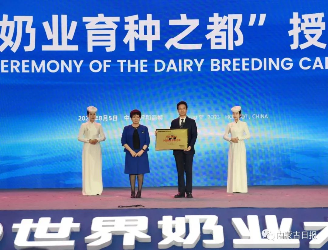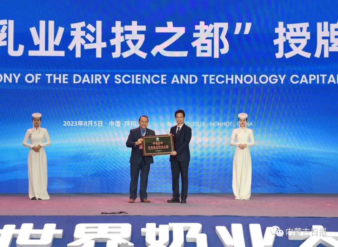 中國奶業(yè)協(xié)會、國際食品科學(xué)技術(shù)聯(lián)盟分別向呼和浩特市授予“中國奶業(yè)育種之都”、“世界乳業(yè)科技之都”稱號。記者 韓卿立 攝