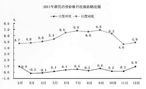 全年居民消費(fèi)價(jià)格總水平比上年上漲5.6%。分城鄉(xiāng)看,城市上漲5.5%,農(nóng)村牧區(qū)上漲5.7%。分類別看,八大類全部呈現(xiàn)上漲局面,其中食品類價(jià)格上漲13.7%,煙酒及用品類價(jià)格上漲2.9%,醫(yī)療保健及個(gè)人用品類價(jià)格上漲2.3%,居住類價(jià)格上漲4.7%。從生產(chǎn)者角度看,工業(yè)生產(chǎn)者購(gòu)進(jìn)價(jià)格指數(shù)和工業(yè)生產(chǎn)者出廠價(jià)格指數(shù)分別比上年上漲6.1%和7.8%。固定資產(chǎn)投資價(jià)格上漲6.3%,農(nóng)產(chǎn)品生產(chǎn)價(jià)格上漲12.8%。