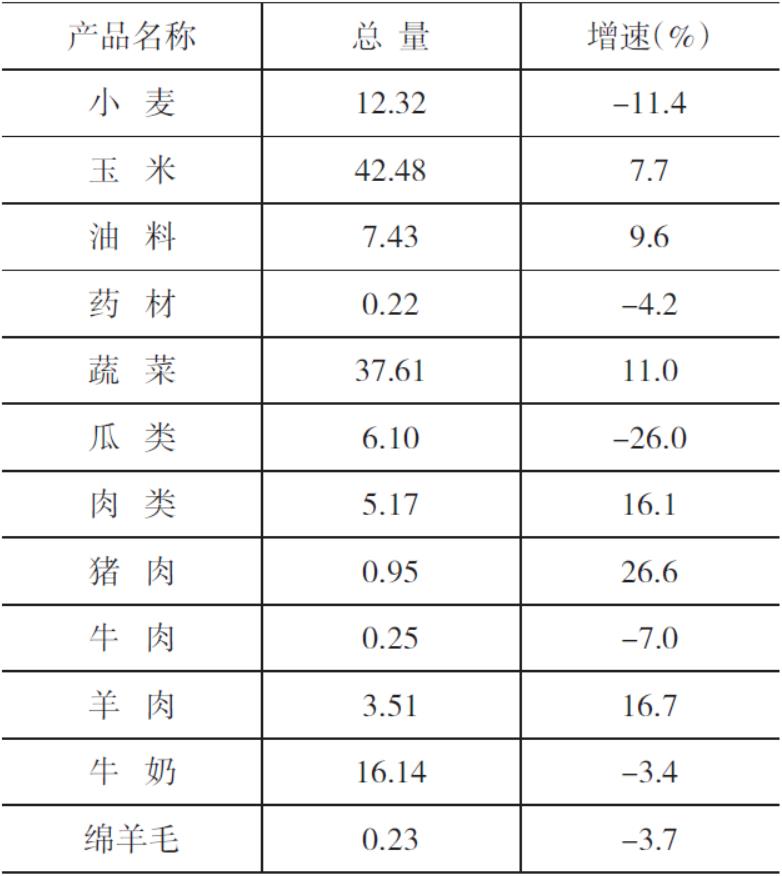 【農業(yè)】 農作物總播種面積132.21萬畝,較上年增加0.09萬畝,增長0.07%。糧食播種面積87.82萬畝,比上年減少0.32萬畝,下降0.4%。其中:小麥面積30.57萬畝,比上年減少3.72萬畝,下降10.8%;玉米面積57.06萬畝,比上年增加3.55萬畝,增長6.6%;經濟作物面積42.90萬畝,比上年增加0.7萬畝,增長1.7%。其中:花葵面積28.32萬畝,比上年增加1.64萬畝,增長6.1%;油葵面積0.83萬畝,比上年減少0.62萬畝,下降42.8%;番茄面積4.17萬畝,比上年增長0.98萬畝,增長30.7%。耕地內牧草1.49萬畝,比上年減少0.3萬畝,同比下降16.8%。