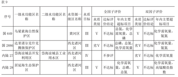 2017年,主要湖泊按全因子評價:烏梁素海水質(zhì)為Ⅴ類,主要超標(biāo)項目為總氮、化學(xué)需氧量、總磷;達(dá)里諾爾湖水質(zhì)為劣Ⅴ類,主要超標(biāo)項目為總磷、總氮、化學(xué)需氧量;居延海水質(zhì)為Ⅴ類,主要超標(biāo)項目為化學(xué)需氧量、總磷、總氮。按雙因子評價:烏梁素海水質(zhì)為Ⅴ類,主要超標(biāo)項目為化學(xué)需氧量、氨氮;達(dá)里諾爾湖水質(zhì)為劣Ⅴ類,主要超標(biāo)項目為化學(xué)需氧量、氨氮;岱海水質(zhì)為劣Ⅴ類,主要超標(biāo)項目為化學(xué)需氧量;居延海水質(zhì)為Ⅴ類,主要超標(biāo)項目為化學(xué)需氧量、高錳酸鹽指數(shù)。2017年水功能區(qū)水質(zhì)與2016年相比,呼倫湖、岱海水質(zhì)變化不大,烏梁素海全因子水質(zhì)略有好轉(zhuǎn)。