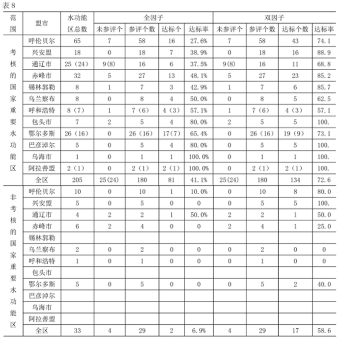考核的國家重要水功能區(qū)達(dá)標(biāo)率情況為:包頭市、巴彥淖爾市、烏海、阿拉善盟為100%,興安盟為88.9%,錫林郭勒盟為85.7%,赤峰市為85.2%,呼倫貝爾市為74.1%,鄂爾多斯市為73.1%,通遼市為68.8%,烏蘭察布市為62.5%,呼和浩特市為57.1%。見表8。