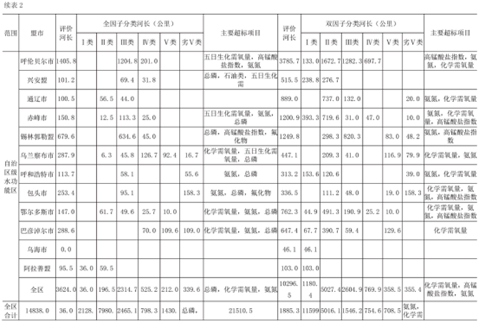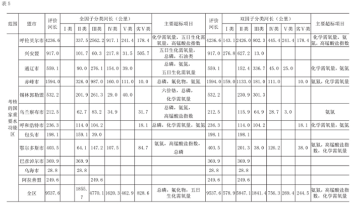 2017年,全區(qū)共監(jiān)測水功能區(qū)560個,實際參加評價的水功能區(qū)437個,有95個水功能區(qū)由于河干、斷流、本底值沒有參加評價,有28個無水質(zhì)目標(biāo)的排污控制區(qū),只進(jìn)行監(jiān)測,不參與考核。參加評價的河長21510.5公里。按雙因子(指標(biāo)為化學(xué)需氧量、高錳酸鹽指數(shù)、氨氮,下同)評價,水質(zhì)為Ⅰ類~Ⅲ類的水功能區(qū)359個,河長18501.2公里,河長所占比例為86.0%,Ⅳ類~劣Ⅴ類的水功能區(qū)78個,河長3009.3公里,河長所占比例為14.0%。見表5。