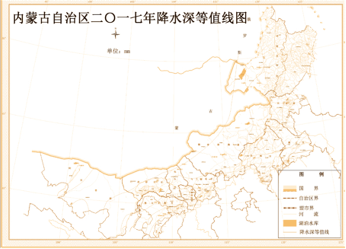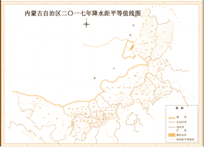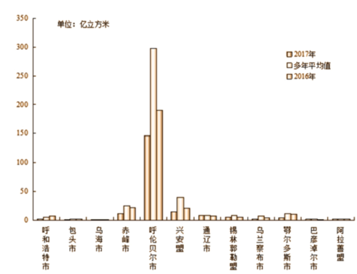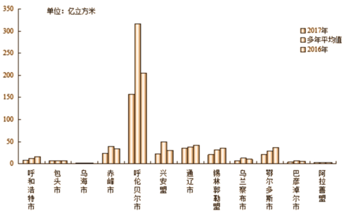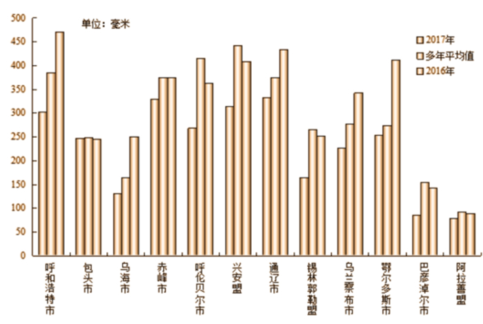 2017年,內(nèi)蒙古自治區(qū)平均降水量208.2毫米,折合降水總量2408.62億立方米,較上年偏少26.4%,較多年平均值偏少26.2%,屬枯水年份。