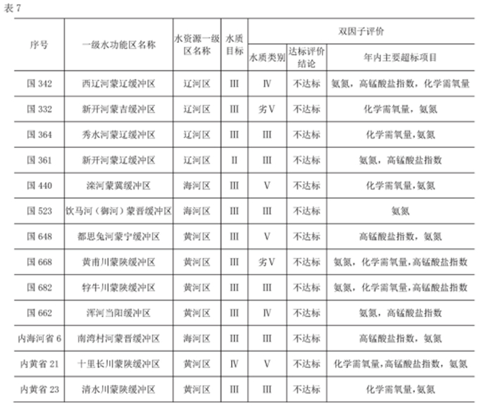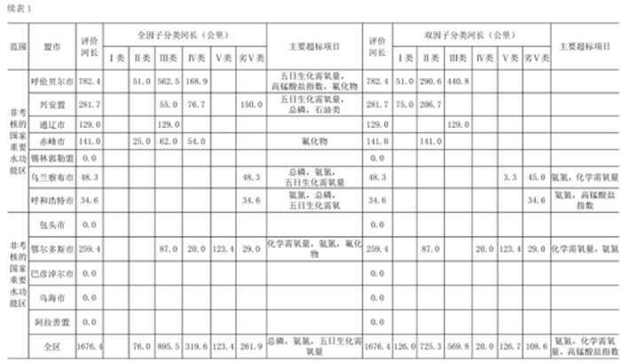 非考核的國家重要水功能區(qū)33個,實際參加評價的水功能區(qū)29個,有4個水功能區(qū)由于河干、斷流沒有參加評價。參加評價的河長1676.4公里。按全因子評價,水質(zhì)為Ⅰ類~Ⅲ類的水功能區(qū)15個,河長971.5公里,河長所占比例為58.0%,Ⅳ類~劣Ⅴ類的水功能區(qū)14個,河長704.9公里,河長所占比例為42.0%;按雙因子評價,水質(zhì)為Ⅰ類~Ⅲ類的水功能區(qū)22個,河長1421.1公里,河長所占比例為84.8%,Ⅳ類~劣Ⅴ類的水功能區(qū)7個,河長255.3公里,河長所占比例為15.2%。