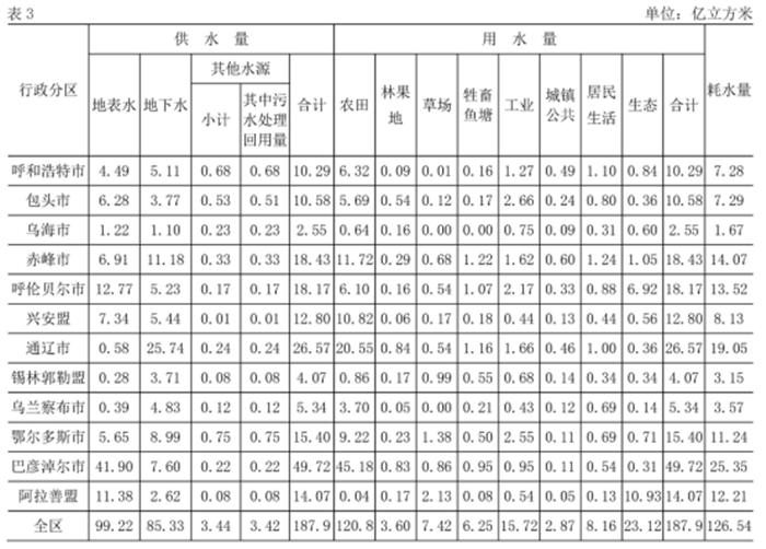 按行政分區(qū)統(tǒng)計,巴彥淖爾市用水量最大,為49.72億立方米,占全區(qū)總用水量26.4%;烏海市用水量最小,為2.55億立方米,占全區(qū)總用水量1.4%。