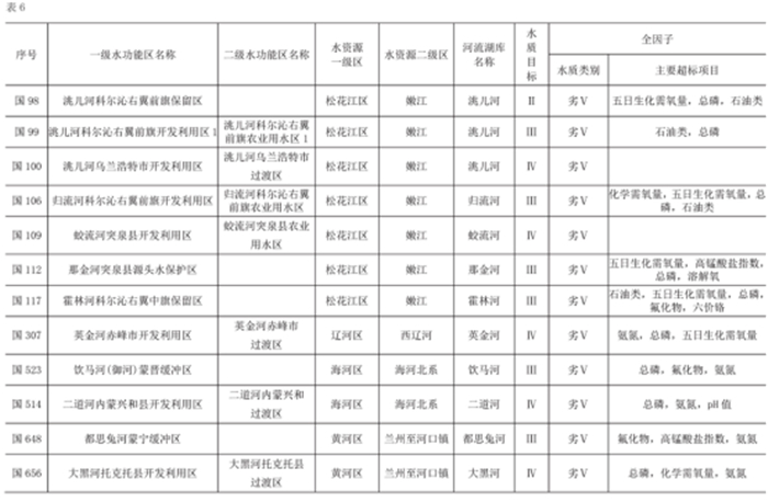 2017年考核的國家重要水功能區(qū)數(shù)量為192個,實際參加評價的水功能區(qū)為168個,有14個水功能區(qū)由于河干、斷流沒有參加評價,另有10個水功能區(qū)由于本底值(根據(jù)松遼水資?!?016〕38號文件)不參與評價與考核,參加評價的河長9537.6公里。按全因子(根據(jù)《地表水環(huán)境質(zhì)量標(biāo)準(zhǔn)(GB3838-2002)》,全因子為除水溫、總氮、糞大腸菌群以外21項,飲用水源區(qū)增加5項,下同)評價,水質(zhì)為Ⅰ類~Ⅲ類的水功能區(qū)109個,河長6625.8公里,河長所占比例為69.5%,Ⅳ類~劣Ⅴ類的水功能區(qū)59個,河長2911.8公里,河長所占比例為30.5%;按雙因子評價,水質(zhì)為Ⅰ類~Ⅲ類的水功能區(qū)141個,河長8267.4公里,河長所占比例為86.7%,Ⅳ類~劣Ⅴ類的水功能區(qū)27個,河長1270.2公里,河長所占比例為13.3%。