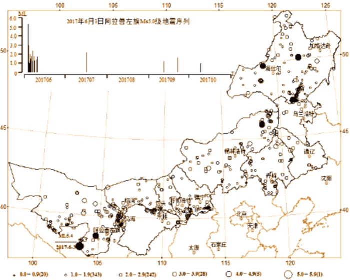 【地震活動】 2017年,內(nèi)蒙古自治區(qū)發(fā)生ML≥1.0級地震639次,其中ML0.0~0.9級地震20次,ML1.0~1.9級地震343次,ML2.0~2.9級地震242次,ML3.0~3.9級地震28次,ML4.0~4.9級地震5次,ML5.0~5.9級地震1次。最大地震是2017年6月3日18時11分阿拉善左旗(北緯37°59′,東經(jīng)103°34′)發(fā)生的Ms5.0(ML 5.4)級地震。次大地震是2017年9月28日扎蘭屯市(北緯47°18′,東經(jīng)121°14′)發(fā)生的ML 4.5級地震。以上地震次數(shù)統(tǒng)計均為可定位地震,而且不包含阿拉善左旗Ms5.0級地震的余震序列,余震另做統(tǒng)計。