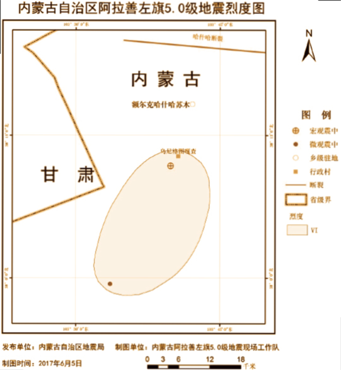 發(fā)生1次中強地震 2017年,6月3日18時11分阿拉善左旗(北緯37°59′,東經(jīng)103°34′)發(fā)生的Ms5.0級地震,震源深度15km。內(nèi)蒙古自治區(qū)地震局派出地震現(xiàn)場工作隊開展監(jiān)測、考察和評估工作。震區(qū)西部為沙漠地區(qū),人煙稀少。通過深入災(zāi)區(qū),進行現(xiàn)場災(zāi)害調(diào)查,確定此次地震等震線長軸呈近東西向至北東東走向分布,本次地震沒有造成人員傷亡。