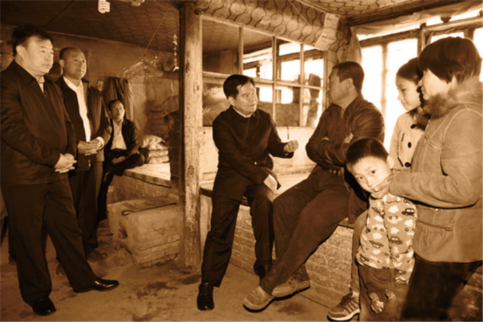 4月15日,自治區(qū)黨委書記、人大常委會主任李紀恒(右五)在突泉鎮(zhèn)東城村貧困戶張海順家中了解日常生活情況(王啟義 供)