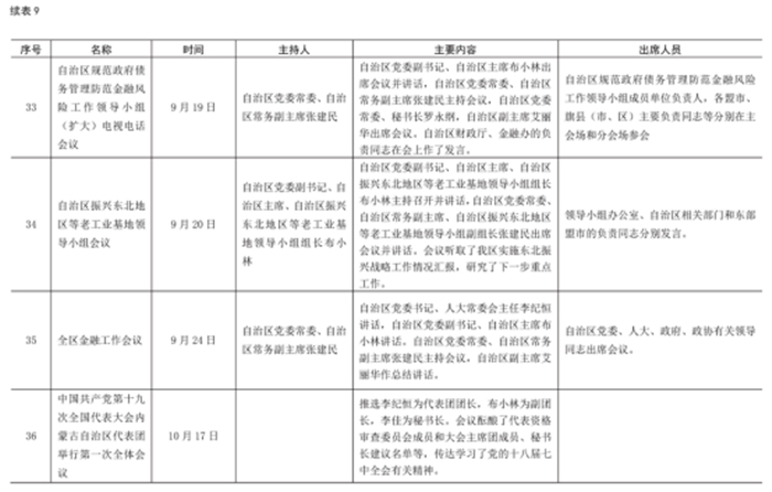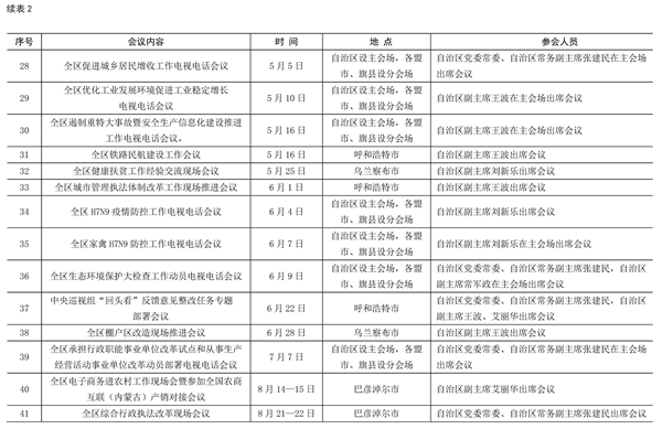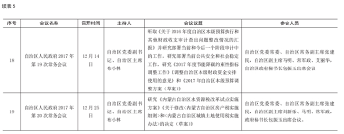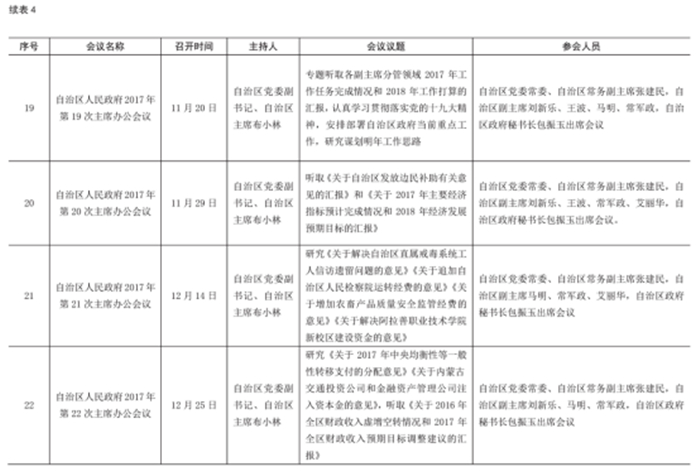 2017年,共召開政府常務(wù)會(huì)議19次,主席辦公會(huì)議22次,政府工作會(huì)議44次,其他重要會(huì)議40次。 全年,自治區(qū)主席共出席重要活動(dòng)92次。