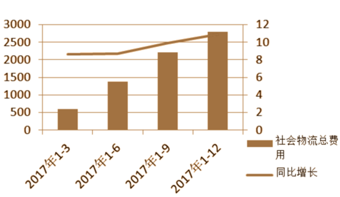 社會物流總費用保持增長,與GDP的比率高于全國平均水平 2017年,社會物流總費用2801.6億元,同比增長10.9%。社會物流總費用與GDP的比率為17.4%,高于全國2.8個百分點,全年呈平穩(wěn)運行態(tài)勢。反映出全區(qū)物流成本仍處于較高水平,未來仍有較大的進步空間。