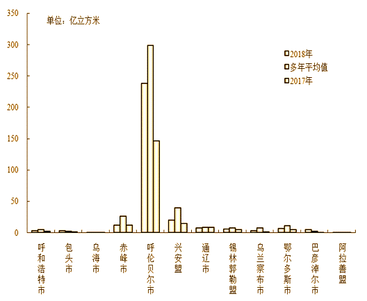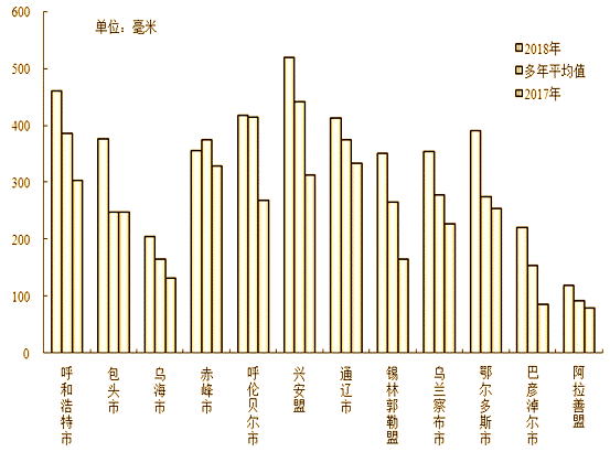 2018年內(nèi)蒙古自治區(qū)平均降水量328.2毫米,折合降水總量3796.43億立方米,較上年增加57.6%,較多年平均值增加16.3%,屬偏豐年份。