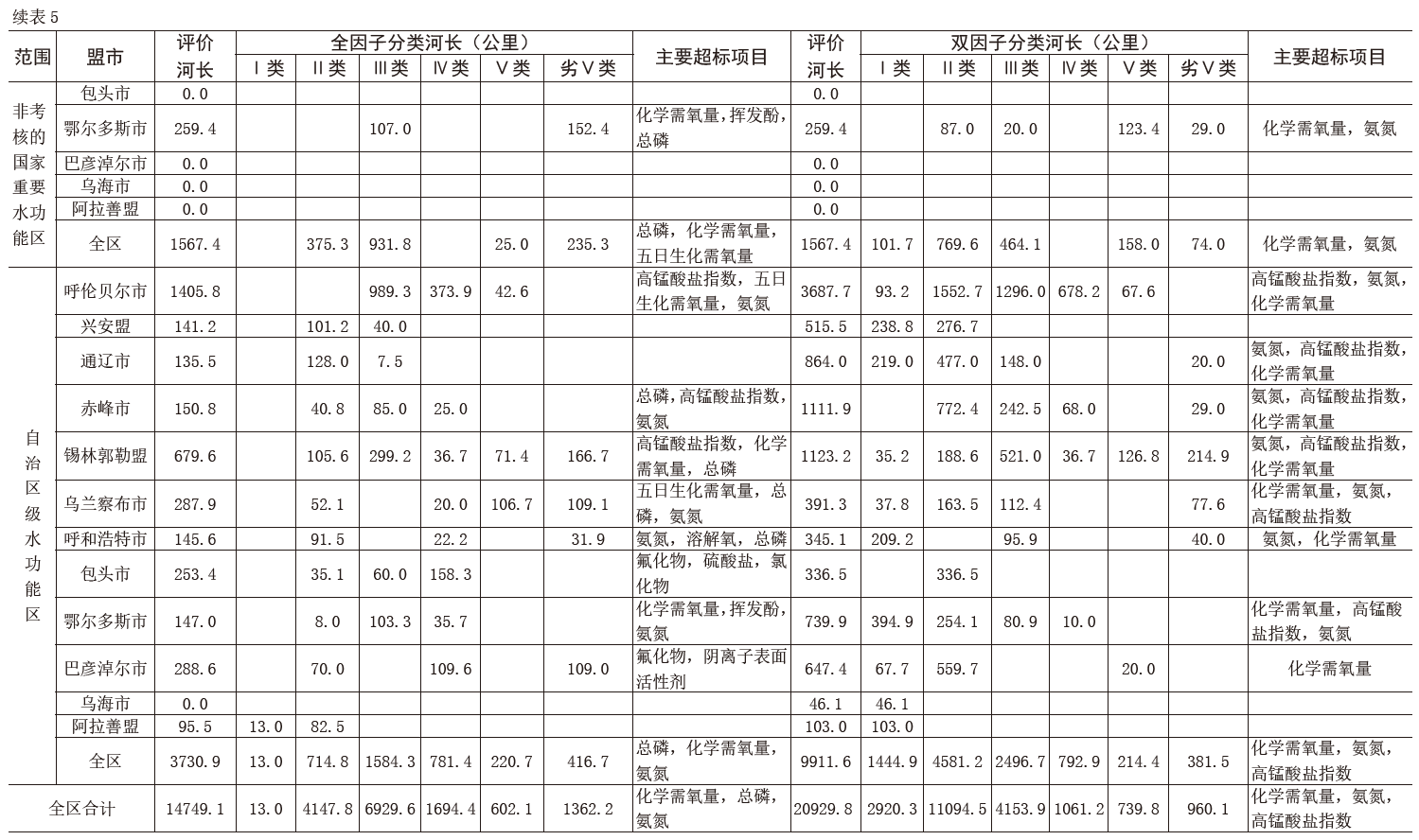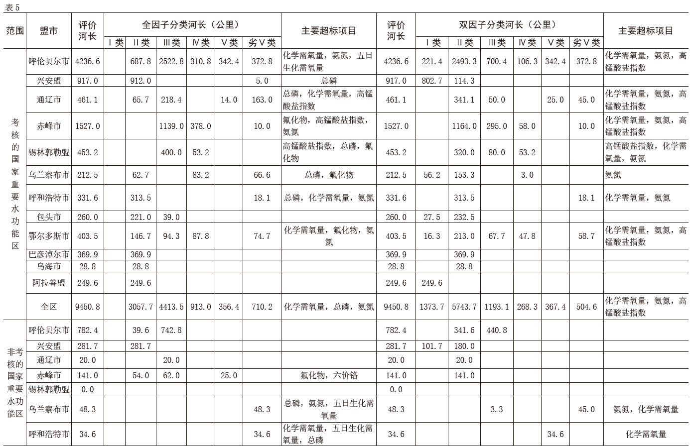 注:表5中自治區(qū)級(jí)水功能區(qū)根據(jù)監(jiān)測(cè)方案,有些水功能區(qū)只監(jiān)測(cè)雙因子,不監(jiān)測(cè)全因子,故河長(zhǎng)和超標(biāo)項(xiàng)目不一致。