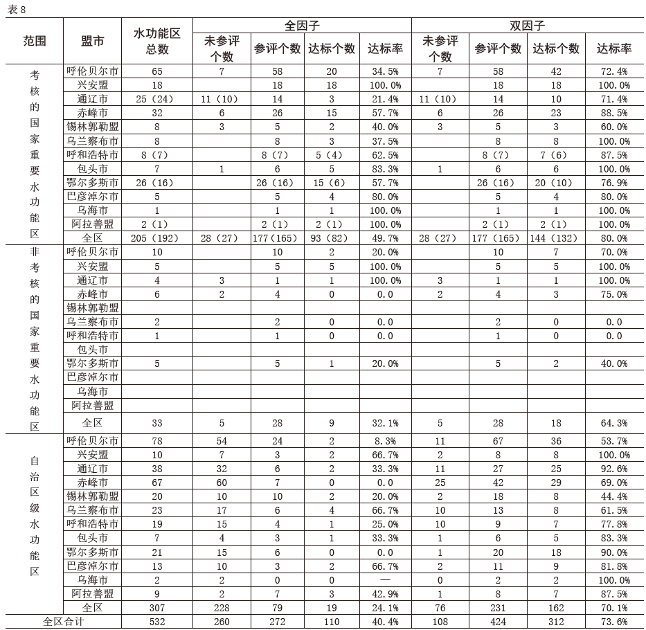 考核的國(guó)家重要水功能區(qū)達(dá)標(biāo)率情況為:興安盟、烏蘭察布市、包頭市、烏海、阿拉善盟為100%,赤峰市為88.5%,呼和浩特市為87.5%,巴彥淖爾市為80.0%,鄂爾多斯市為76.9%,呼倫貝爾市為72.4%,通遼市為71.4%,錫林郭勒盟為60.0%。見(jiàn)表8。