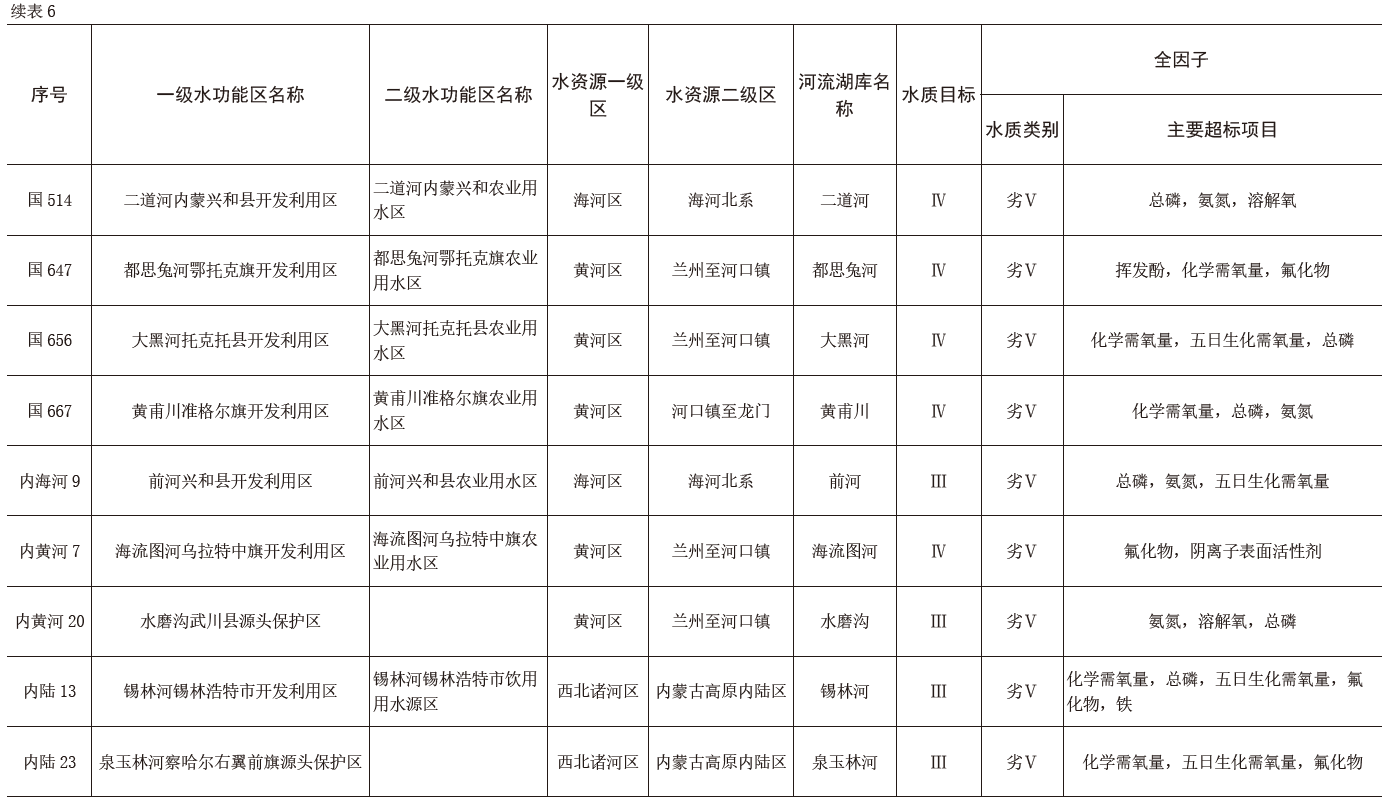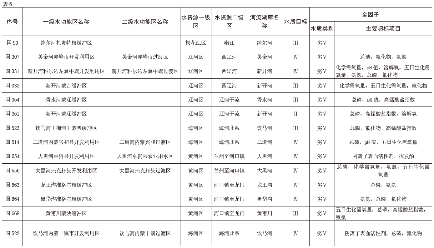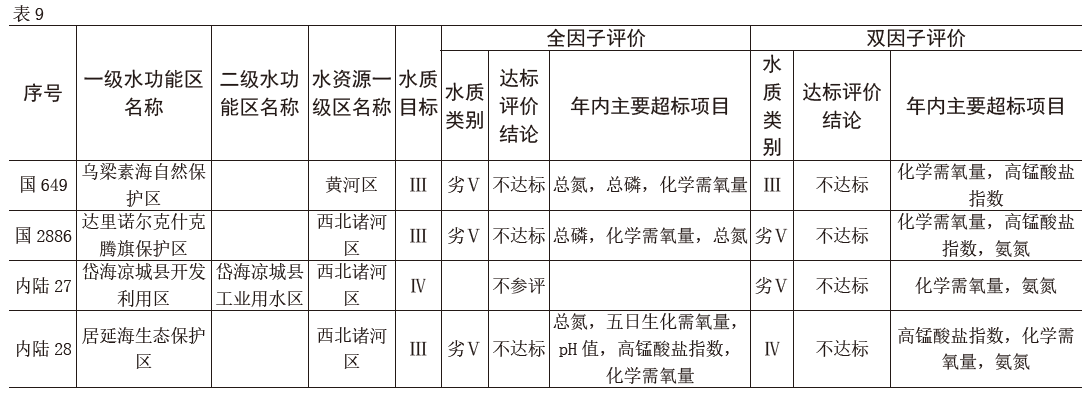 按雙因子評(píng)價(jià):烏梁素海自然保護(hù)區(qū)全年水質(zhì)為Ⅲ類(lèi),汛期水質(zhì)為Ⅲ類(lèi),非汛期水質(zhì)為Ⅲ類(lèi),主要超標(biāo)項(xiàng)目為化學(xué)需氧量,高錳酸鹽指數(shù);達(dá)里諾爾克什克騰旗保護(hù)區(qū)全年水質(zhì)為劣Ⅴ類(lèi),汛期水質(zhì)為劣Ⅴ類(lèi),非汛期水質(zhì)為劣Ⅴ類(lèi),主要超標(biāo)項(xiàng)目為化學(xué)需氧量,高錳酸鹽指數(shù),氨氮;岱海涼城縣工業(yè)用水區(qū)全年水質(zhì)為劣Ⅴ類(lèi),汛期水質(zhì)為劣Ⅴ類(lèi),非汛期水質(zhì)為劣Ⅴ類(lèi),主要超標(biāo)項(xiàng)目為化學(xué)需氧量,氨氮;居延海生態(tài)保護(hù)區(qū)全年水質(zhì)為Ⅳ類(lèi),汛期水質(zhì)為Ⅴ類(lèi),非汛期水質(zhì)為Ⅲ類(lèi),主要超標(biāo)項(xiàng)目為高錳酸鹽指數(shù),化學(xué)需氧量,氨氮。