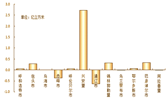 按行政分區(qū)統(tǒng)計(jì),赤峰市和通遼市年末蓄水總量較年初分別減少0.37億立方米和0.63億立方米,呼和浩特市、包頭市、呼倫貝爾市、興安盟、錫林郭勒盟、烏蘭察布市、鄂爾多斯市、巴彥淖爾市年末蓄水總量較年初分別增加0.06億立方米、0.29億立方米、0.06億立方米、2.72億立方米、0.33億立方米、0.01億立方米、0.07億立方米和0.33億立方米。