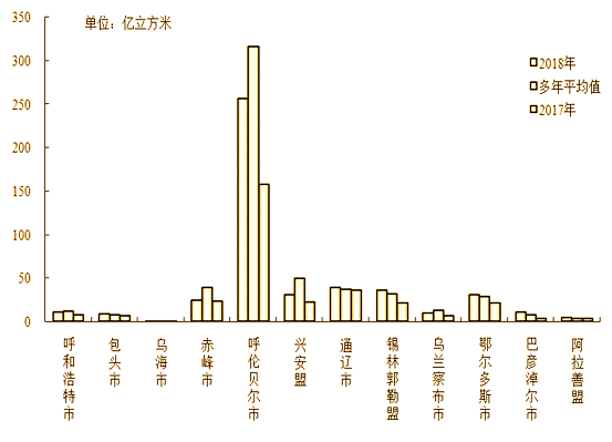 圖2:2018年內(nèi)蒙古行政分區(qū)地表水資源量與多年平均值及上年比較