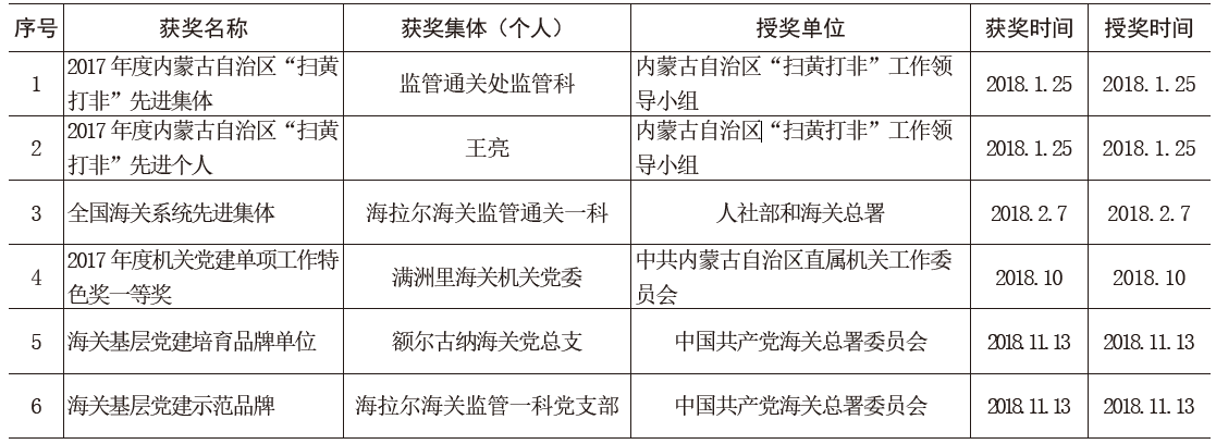 滿洲里海關(guān)2018 年所獲榮譽(yù)情況統(tǒng)計(jì)表
