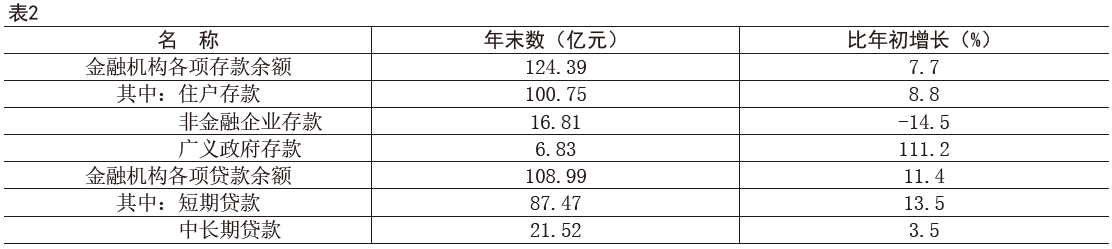 【金融業(yè)】 年末,全旗金融機(jī)構(gòu)各項(xiàng)存款余額124.39億元,同比增長(zhǎng)7.7%。其中,住戶存款100.75億元,同比增長(zhǎng)8.8%;非金融企業(yè)存款16.81億元,同比下降14.5%;廣義政府存款6.83億元,同比增長(zhǎng)111.2%。全旗金融機(jī)構(gòu)各項(xiàng)貸款余額108.99億元,同比增長(zhǎng)11.4%。其中,住戶貸款87.47億元,同比增長(zhǎng)13.5%;非金融企業(yè)及相關(guān)團(tuán)體貸款21.52億元,同比增長(zhǎng)3.5%。