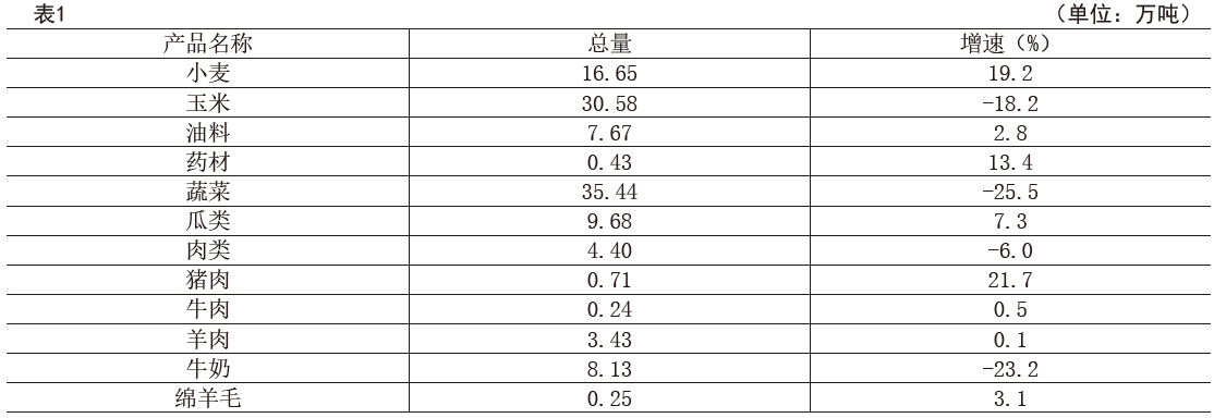 【農(nóng)業(yè)】 農(nóng)作物總播種面積9.16萬公頃,比上年增加0.22萬公頃,同比增長(zhǎng)2.5%。糧食播種面積5.47萬公頃,比上年減少0.05萬公頃,同比下降0.9%。其中,小麥面積2.5萬公頃,比上年增加0.197萬公頃,同比增長(zhǎng)8.6%;玉米面積2.97萬公頃,比上年減少0.24萬公頃,同比下降7.5%。經(jīng)濟(jì)作物面積3.688萬公頃,比上年增加0.352萬公頃,同比增長(zhǎng)10.6%。其中,油料作物面積2.15萬公頃,比上年增加0.21萬公頃,同比增長(zhǎng)10.6%;蔬菜面積0.61萬公頃,比上年減少0.075萬公頃,同比下降10.9%。其中,番茄面積0.21萬公頃,比上年減少0.103萬公頃,同比下降33.1%;瓜類面積0.21萬公頃,比上年增加0.013萬公頃,同比增長(zhǎng)6.5%。耕地內(nèi)牧草0.078萬公頃,比上年減少0.001萬公頃,同比下降1.7%。
