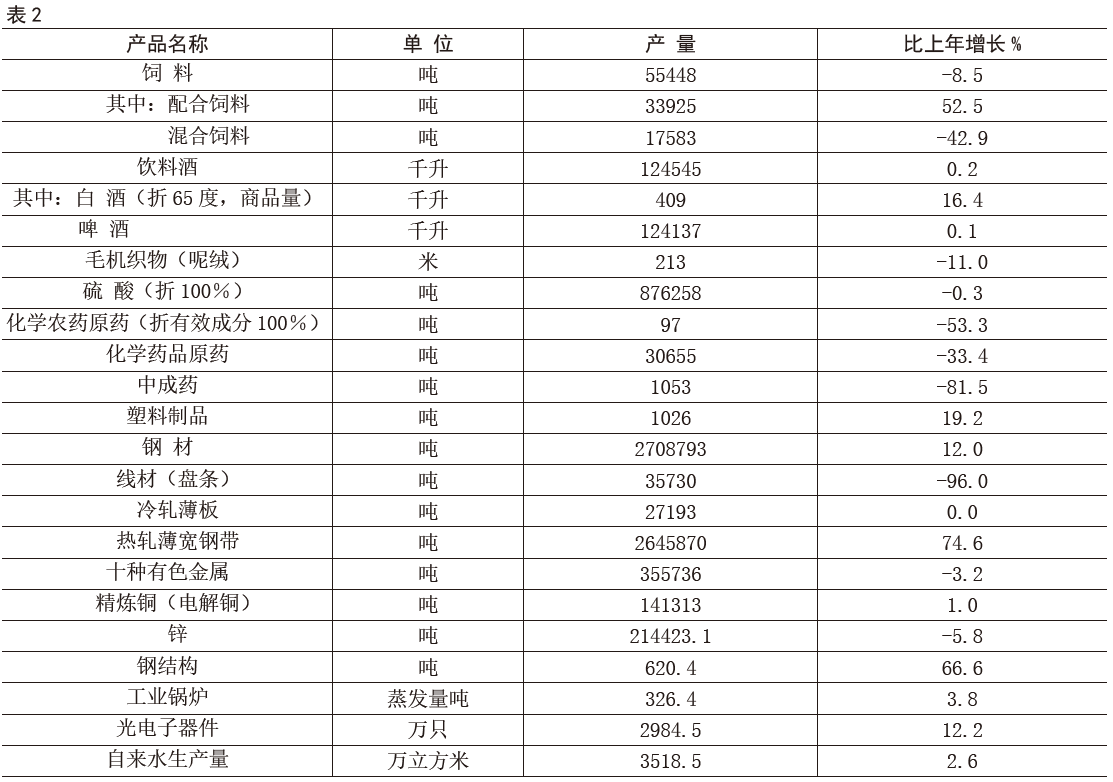 主要工業(yè)產(chǎn)品產(chǎn)銷良好 從主要工業(yè)產(chǎn)品產(chǎn)量看,全區(qū)飲料酒產(chǎn)量1.25億升,比上年增長0.2%;硫酸87.63萬噸,比上年下降0.3%;精煉銅14.13萬噸,比上年增長1.0%;鋼材270.88萬噸,比上年增長12.0%;光電子器件2985萬只,比上年增長12.2%。產(chǎn)品銷售率99.7%,比上年提高0.3個百分點。