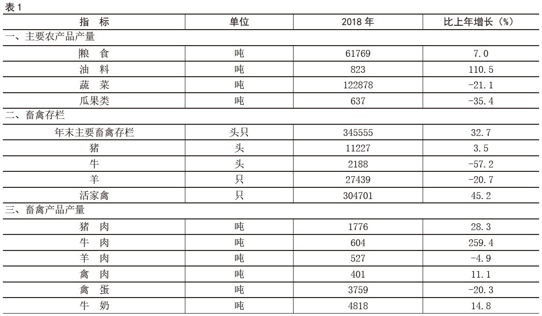 【農(nóng)業(yè)】 農(nóng)業(yè)生產(chǎn)穩(wěn)步發(fā)展。全年農(nóng)作物總播種面積14912.55公頃,比上年增長9.1%。其中,糧食作物播種面積13459公頃,比上年增長15.6%;經(jīng)濟作物播種面積1453.55公頃,比上年下降28.4%。糧食總產(chǎn)量6.18萬噸,比上年增長8.4%。經(jīng)濟作物中,油料產(chǎn)量823噸,比上年增長110.5%;蔬菜產(chǎn)量12.29萬噸,比上年下降21.1%;瓜果類產(chǎn)量637噸,比上年下降35.4%。
