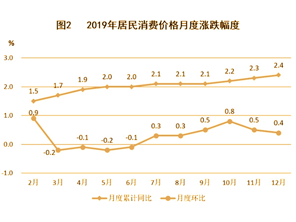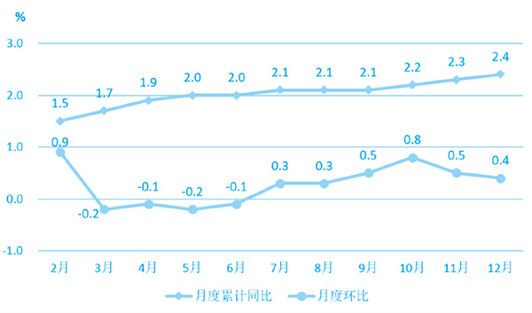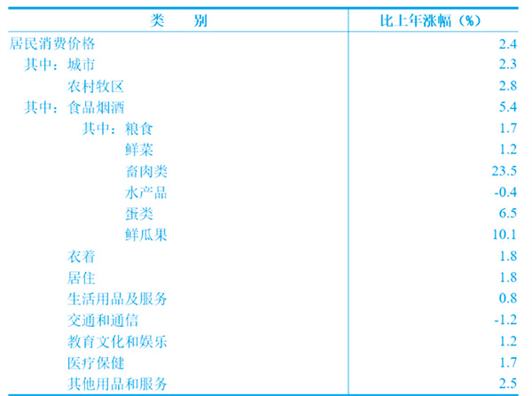 全年居民消費價格比上年上漲2.4%。分城鄉(xiāng)看,城市上漲2.3%,農(nóng)村牧區(qū)上漲2.8%。分類別看,食品煙酒類價格上漲5.4%,衣著類上漲1.8%,居住類上漲1.8%,生活用品及服務(wù)類上漲0.8%,交通和通信類下降1.2%,教育文化和娛樂類上漲1.2%,醫(yī)療保健類上漲1.7%,其他用品和服務(wù)類上漲2.5%。從工業(yè)生產(chǎn)者角度看,工業(yè)生產(chǎn)者出廠價格和購進價格分別上漲2.1%和1.1%。固定資產(chǎn)投資價格上漲1.7%,農(nóng)產(chǎn)品生產(chǎn)者價格上漲5.6%。