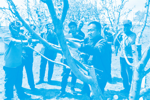 在巴林左旗查干哈達(dá)蘇木查干套海嘎查種植戶興安家的庭院現(xiàn)場教學(xué),手把手教種植戶果樹修剪方法,