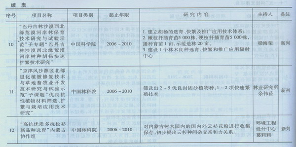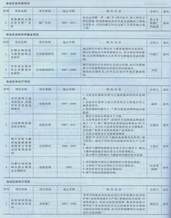 【科研項(xiàng)目】自治區(qū)林業(yè)科學(xué)研究院承擔(dān)的科研項(xiàng)目共計(jì)57項(xiàng),其中:延續(xù)項(xiàng)目27項(xiàng),新列項(xiàng)目30項(xiàng)(詳見2007年科研項(xiàng)目表)。按項(xiàng)目來(lái)源統(tǒng)計(jì)科技部成果轉(zhuǎn)化項(xiàng)目1項(xiàng)、國(guó)家自然科學(xué)基金1項(xiàng)、國(guó)家林業(yè)部5項(xiàng)、內(nèi)蒙古外專局3項(xiàng)、內(nèi)蒙古發(fā)改委1項(xiàng)、內(nèi)蒙古自然科學(xué)基金2項(xiàng)、內(nèi)蒙古林業(yè)廳4項(xiàng)、內(nèi)蒙古財(cái)政廳1項(xiàng),參加國(guó)家“十一五”科技支撐計(jì)劃專題或子專題12項(xiàng)。內(nèi)蒙古林業(yè)科學(xué)研究院2007年科研項(xiàng)目表