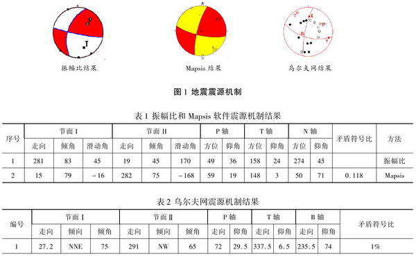 震源機(jī)制解:收集了16個臺站的P波初動符號,用3種方法所做的震源機(jī)制如下圖1和下表1、表2:從觀測到的可定位余震震中分布圖看到,余震的優(yōu)勢分布方向為NE向,發(fā)生的余震位于主震的西南方向。余震分布長軸約17公里。從可定位的余震震中分布圖和震源機(jī)制解綜合分析,認(rèn)為北東向截面為地震的破裂面。主壓應(yīng)力軸方位為NE向。